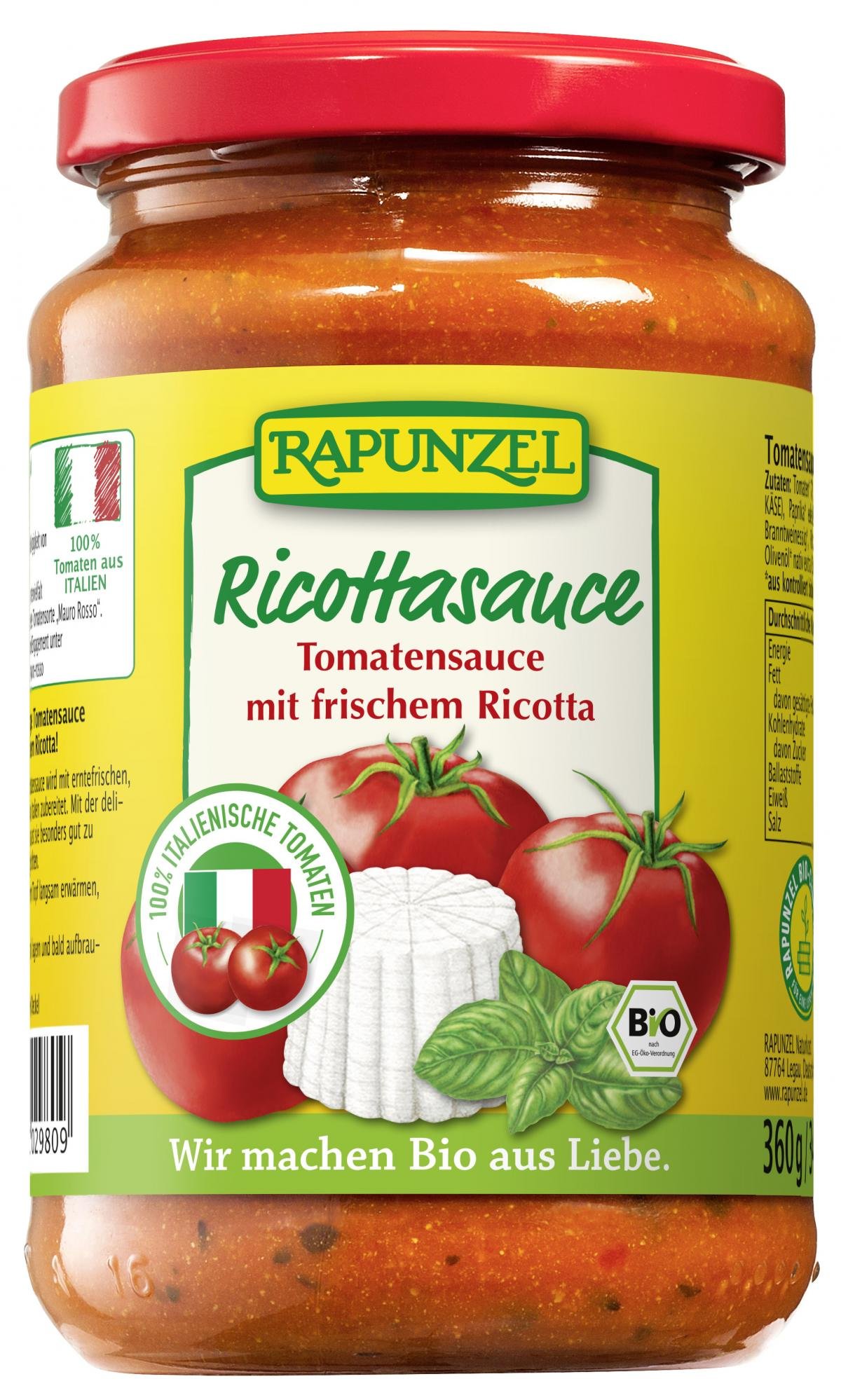 Schmackhaft-würzige Tomatensauce - mit frischem Ricotta verfeinert. Durch die delikate Käsenote passt sie besonders in die mediterrane Gourmet-Küche und zaubert schnell ein italienisches Schlemmergericht auf Ihren Teller. Die in dieser Tomatensauce enthaltenen Tomaten sind zu 100% aus Italien. Rapunzel unterstützt die Züchtung und den Erhalt von samenfestem Bio-Saatgut, z.B. auch für die Tomatensorte 'Mauro Rosso'.