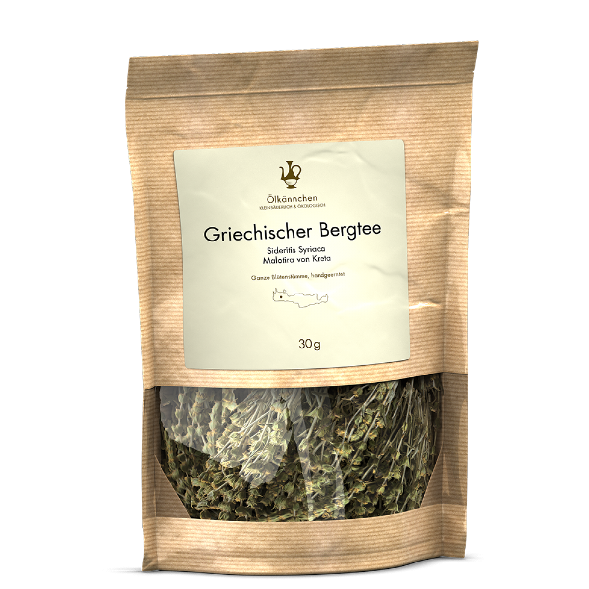 Griechischer Bio Bergtee Sideritis syriaca - Dem griechischen Bergtee oder auch griechischen Eisenkraut (Sideritis) werden vielfältige gesundheitsfördernde Eigenschaften zugesprochen und es gibt verschiedene Unterarten. Die Unterart Sideritis syriaca ist auf Kreta endemisch und wird Malotira genannt. Unser Malotira wächst auf den Felder der Familie Psyllakis, die in den Bergen von Omalos auf Westkreta auf einer Höhe von ungefähr 1000m liegen. Rodo und Nikos Psyllakis bewahren mit ihrem kleinen landwirtschaftlichen Betrieb nach ökologischen Richtlinien die biologische Vielfalt der Region und leben mit ihrer Leidenschaft für nachhaltigen, naturschützenden Kräuteranbau ihren Respekt vor der Natur. Der Malotira wird von Hand geerntet und die Trocknung geschieht natürlich in Bündeln ohne Zufuhr maschineller Wärme. So werden die einzigartigen Eigenschaften und die besonderen Aromen des Bergtees bewahrt. Malotira schmeckt floral-fruchtig, auch mit leichten Noten von Rose und süßem Salbei. Die Teeblüten in Dolden mit kochendem Wasser aufgießen und ein paar Minuten ziehen lassen. Auch ein zweiter und dritter Aufguss ist möglich. Dann die Stängel vorab entfernen.