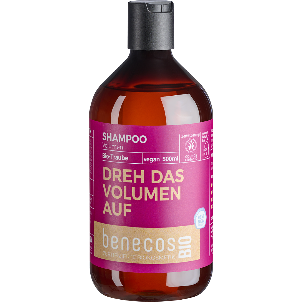 Volumenshampoo für mehr Kraft und Fülle. Mit pflegendem Bio-Traubenkernöl, Süßmandelprotein und regionalem Bio-Apfelsaft. Dermatologisch getestet.